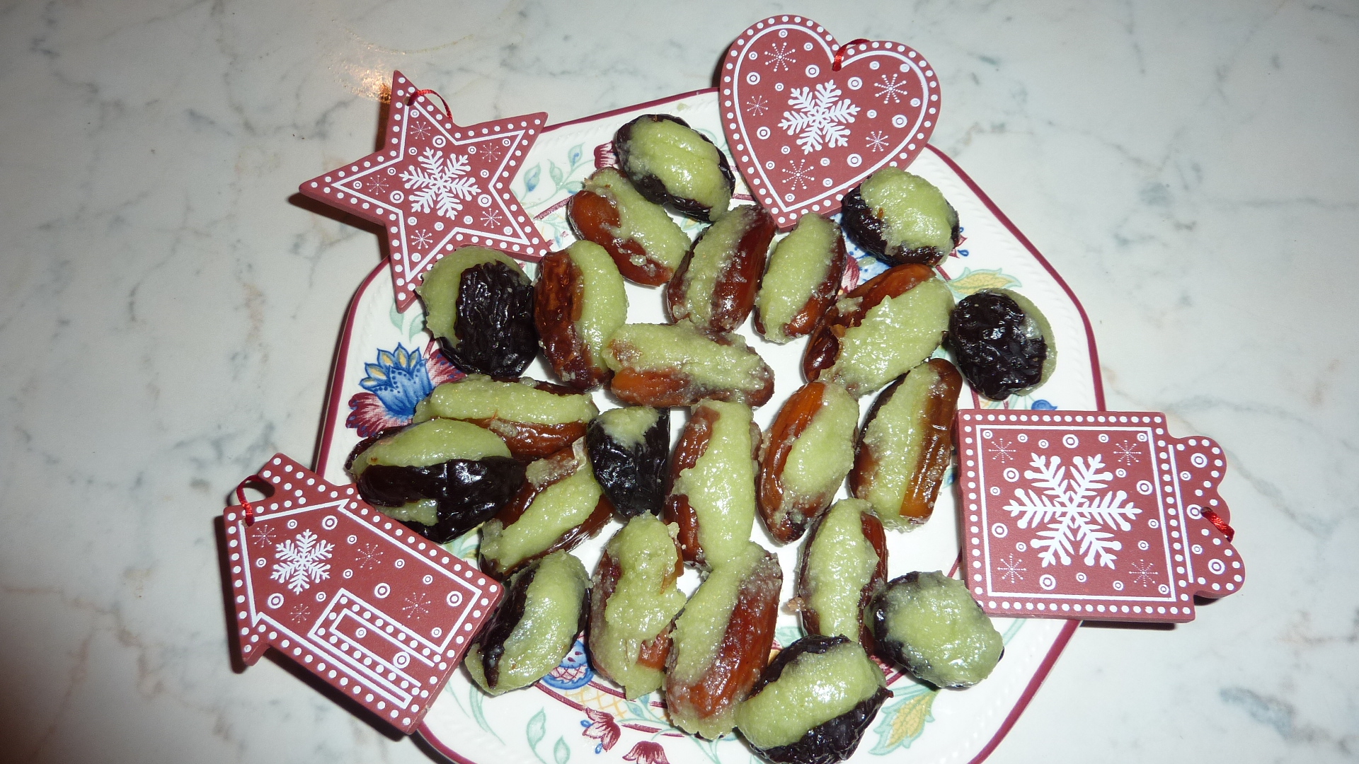 Farcir les dattes (ou pruneaux) avec la pointe d’un couteau et redonner la forme en humectant légèrement les doigts.